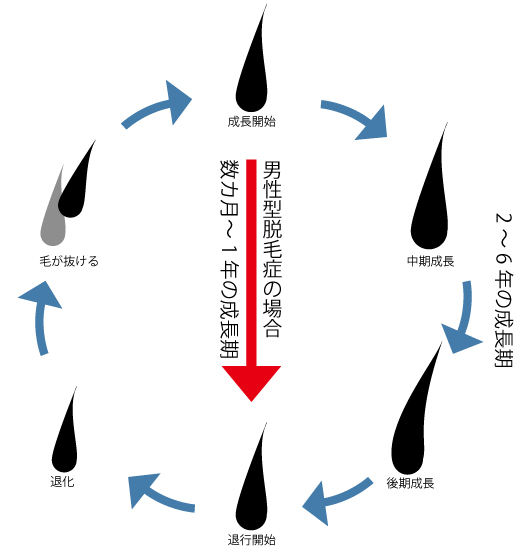 男性型脱毛症になると、成長期が短く、すぐに退行が始まってしまい、細い毛や短い毛が増えて、毛量が減って見えます。