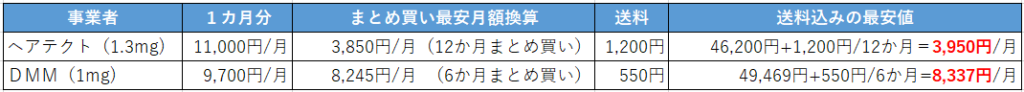 こちらは1か月分だけだとDMMオンラインクリニックの方が安いですが、まとめ買いをする場合はHAIRTECT(ヘアテクト)の方が安いという結果になりました!毎月1,000円安いのは結構な差です。