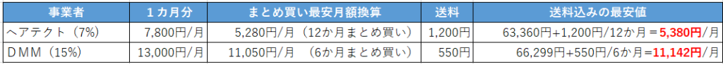 こちらは1か月分のみでもまとめ買いでもヘアテクトの方が安くなっています。濃度が2倍以上違うので単純に比較はできませんが、価格だけ比べるのであればヘアテクトの完勝となりますね。