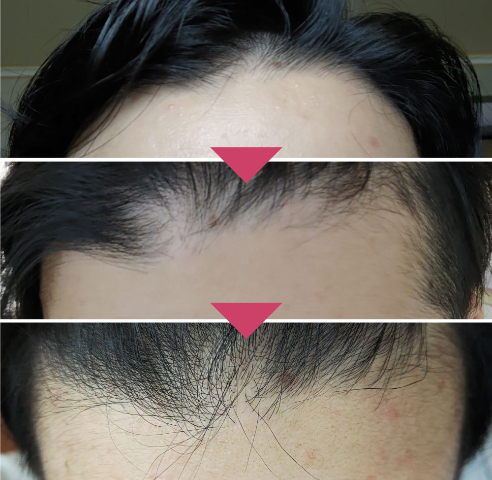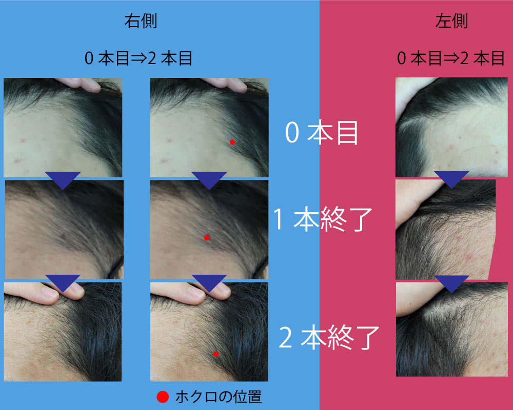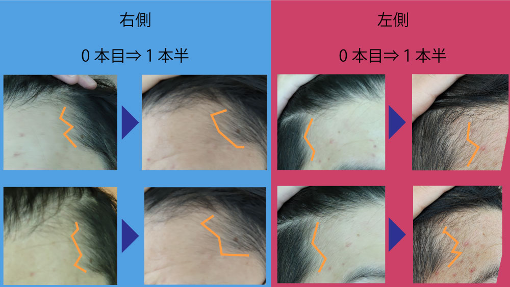 はっきりとした変化は1.5本目の画像がのっぺりしているので分かりづらいですが、生え際がしっかりとしてきた感じがします!