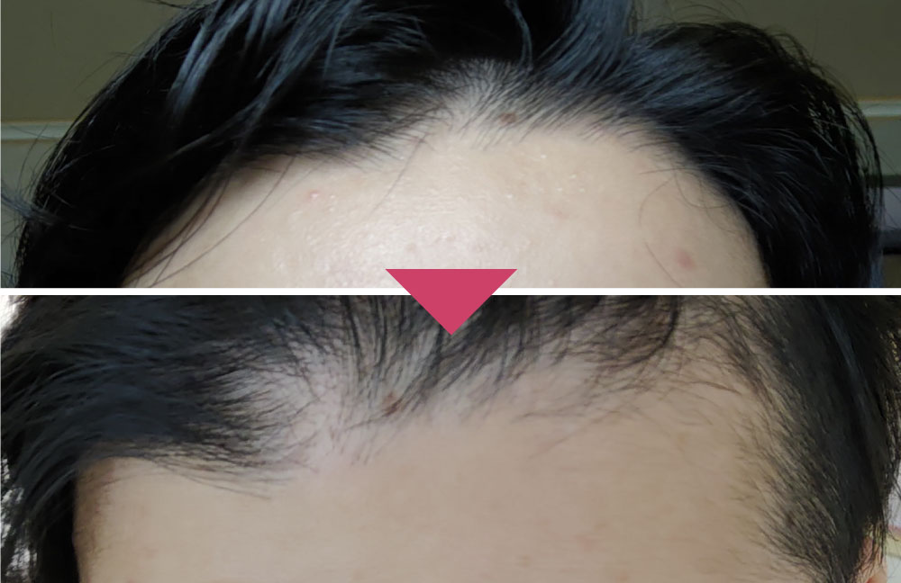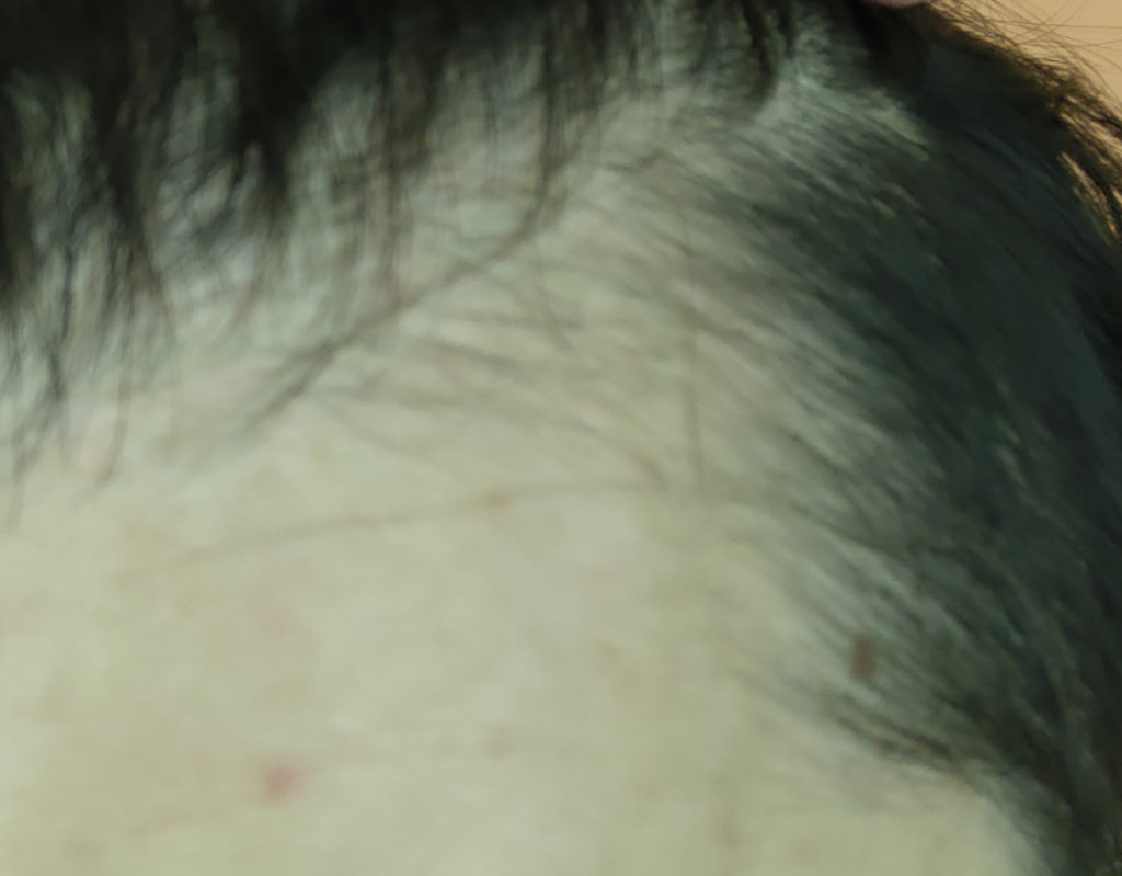 これは明らかに生え始めてますよね。カメラのコントラスト的なものも一定じゃないので分かりにくいですが、生え際のラインが明らかに変わっているような気がします。育毛剤を使い始めて2カ月経たないくらいですが早速目に見える形で効果が表れて驚きました。