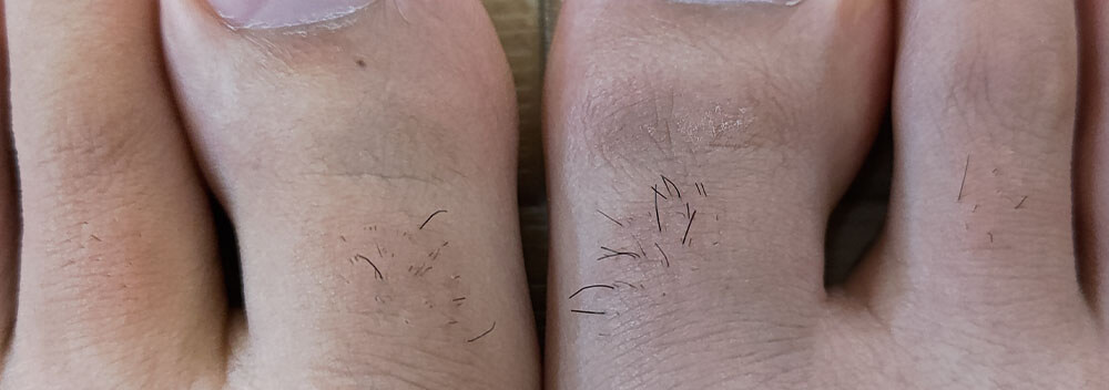 効果測定の方法として、足の指の毛が濃いめに生えているので、左右の足で対照実験を行っていきます。左足に家庭用脱毛器を使い、右足は同じタイミングで毛を剃るだけ(※脱毛時には必ず毛を剃ります)、定期的に脱毛しつつ左右の濃さの違いを観察していきます。