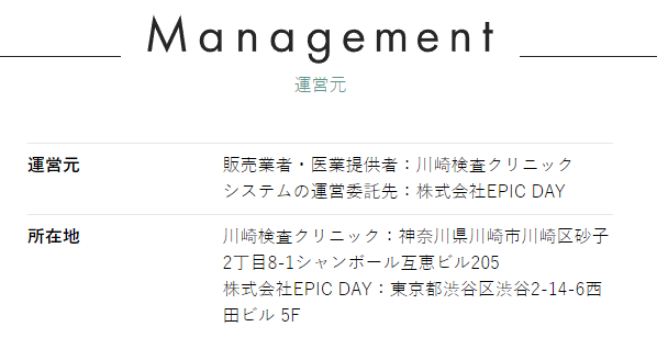 株式会社EPIC DAY (本社:東京都渋谷区、代表取締役社長:西村 真陽、顧問医師:天野 方一)がサービス提供者で販売業者として川崎検査クリニックと協業しているようですね。