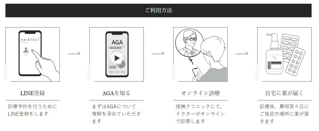下記の画像にもありますが、LINEで登録⇒診療日の予約⇒診療⇒薬が届くという流れです。
