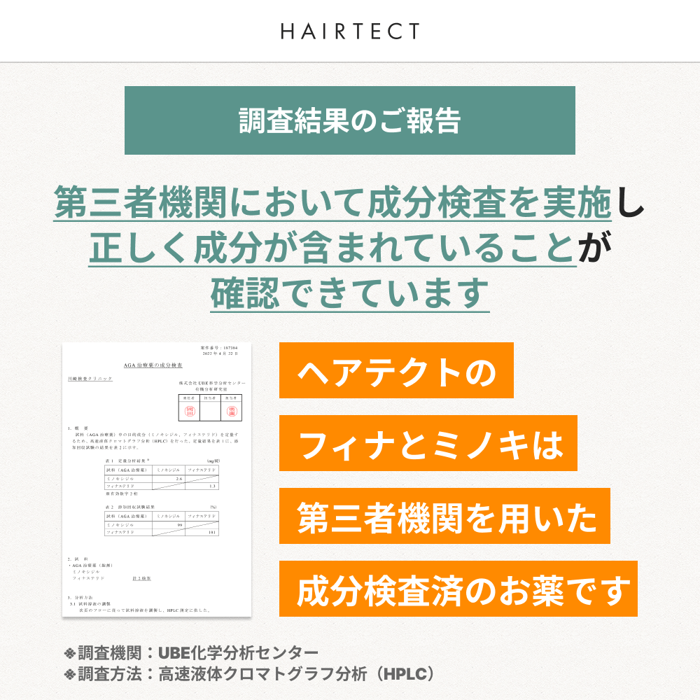 【調査結果のご報告】 いつもお世話になっております。ヘアテクトスタッフです🍀 現在ヘアテクトでは「WINSTON MEDICAL SUPPLYCO.,LTD.」という会社さまのフィナステリドとミノキシジルを取り扱っておりますが、患者さまより「正しく成分が含まれているか不安」という声を頂戴する機会がございました。 ※日本の大手AGAクリニックでも取り扱われているお薬の製薬メーカー様です そこで、「UBE科学分析センター」という医薬品の成分検査を実施されている会社様に対して、当院で処方させていただいているフィナステリドとミノキシジル薬に正しく成分が含まれているかの成分検査を依頼いたしました。 本日は、そちらの調査結果をご報告させていただきます。 ==================== ■調査結果 ・依頼先:UBE科学分析センター ・分析方法:高速液体クロマトグラフ分析(HPLC) ・分析プロセス:フィナ・ミノキの標準品との比較によって①成分が含まれているか②成分量が想定通りかを確認 ・分析結果:フィナ・ミノキそれぞれ、想定容量と同量の成分が正しく含まれておりました ※1000分の1グラム(1mg)の差異は医薬品としての許容幅に収まると判断 ==================== 今後もヘアテクトでは、患者さまのお悩みやご不安に寄り添った治療をお届けできればと考えておりますので、ご不安な点などございましたらお気軽にご相談いただければと思います👨⚕️👩⚕️ また、診察費は無料で、国内製フィナステリド1mgや国内製デュタステリド0.5mg、ミノキシジルローションなど様々なお薬の取扱もございますので、ご検討の方はLINEでご相談いただくか診察予約をお願いいたします💊 今後とも、ヘアテクトをよろしくお願いいたします。